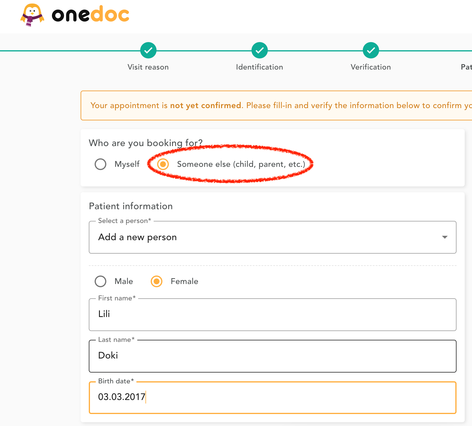 However, some things are different in step 4 “Patient info”. This is where you will specify that the appointment is not for you, the account holder, but for someone else.