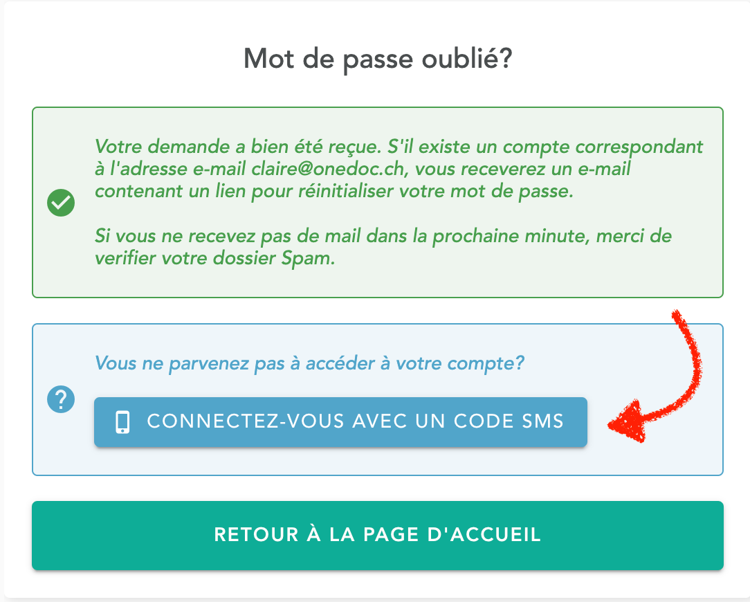 - Après avoir fait une tentative de réinitialisation de mot de passe via email, cliquez sur "connectez-vous avec un code SMS":